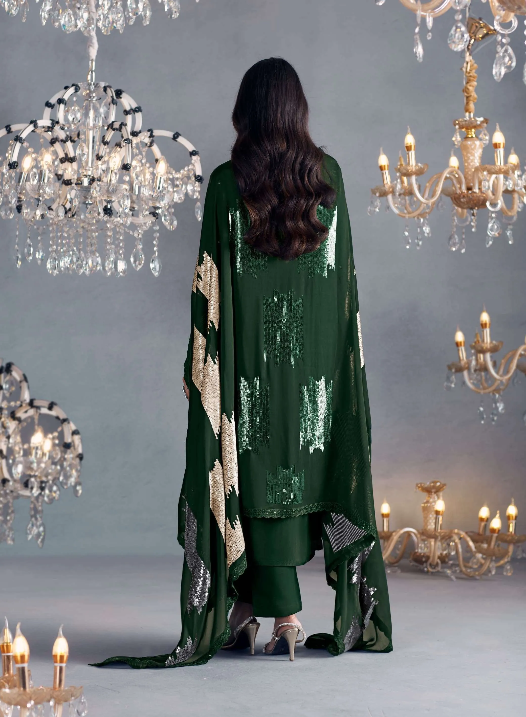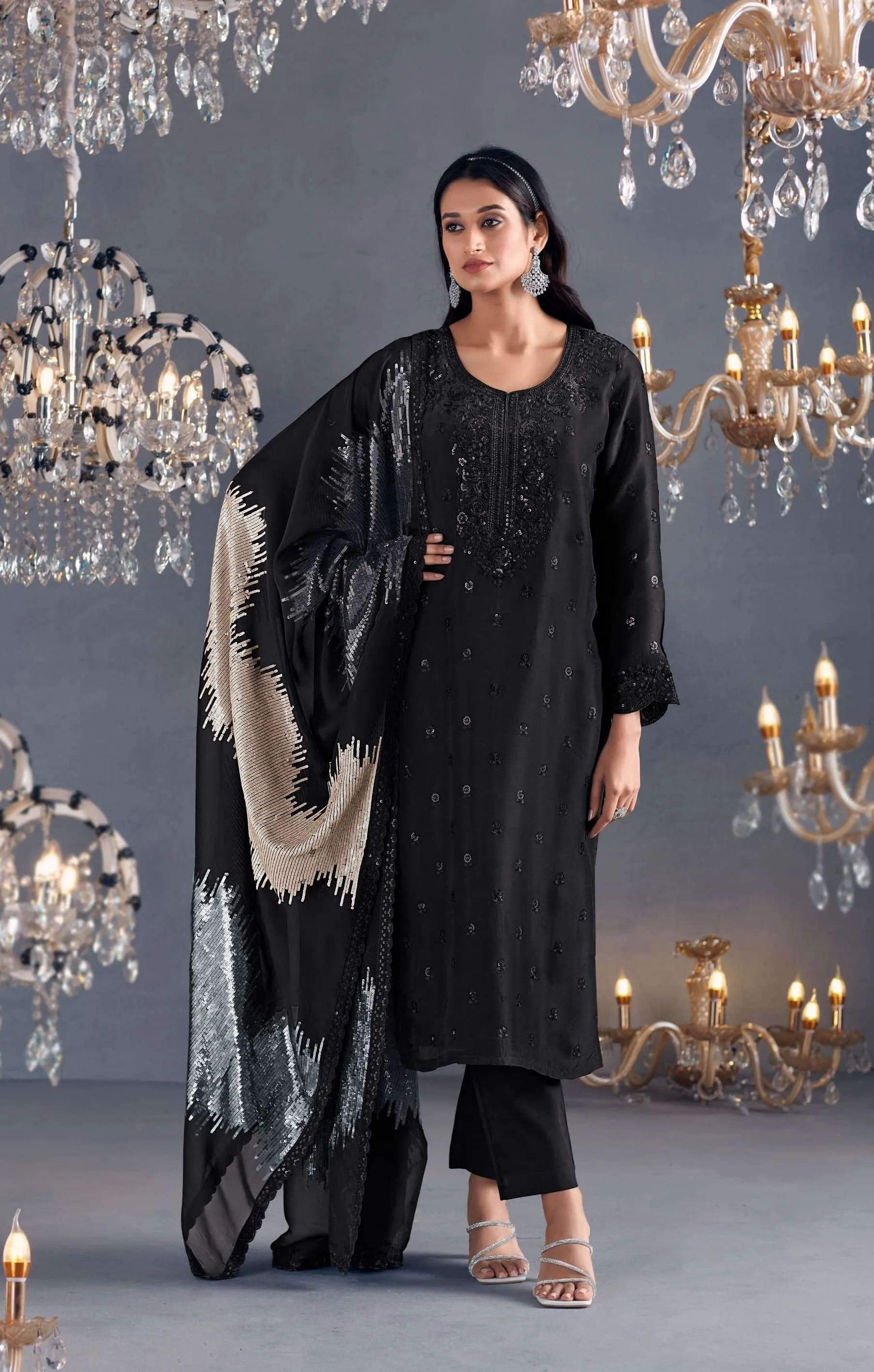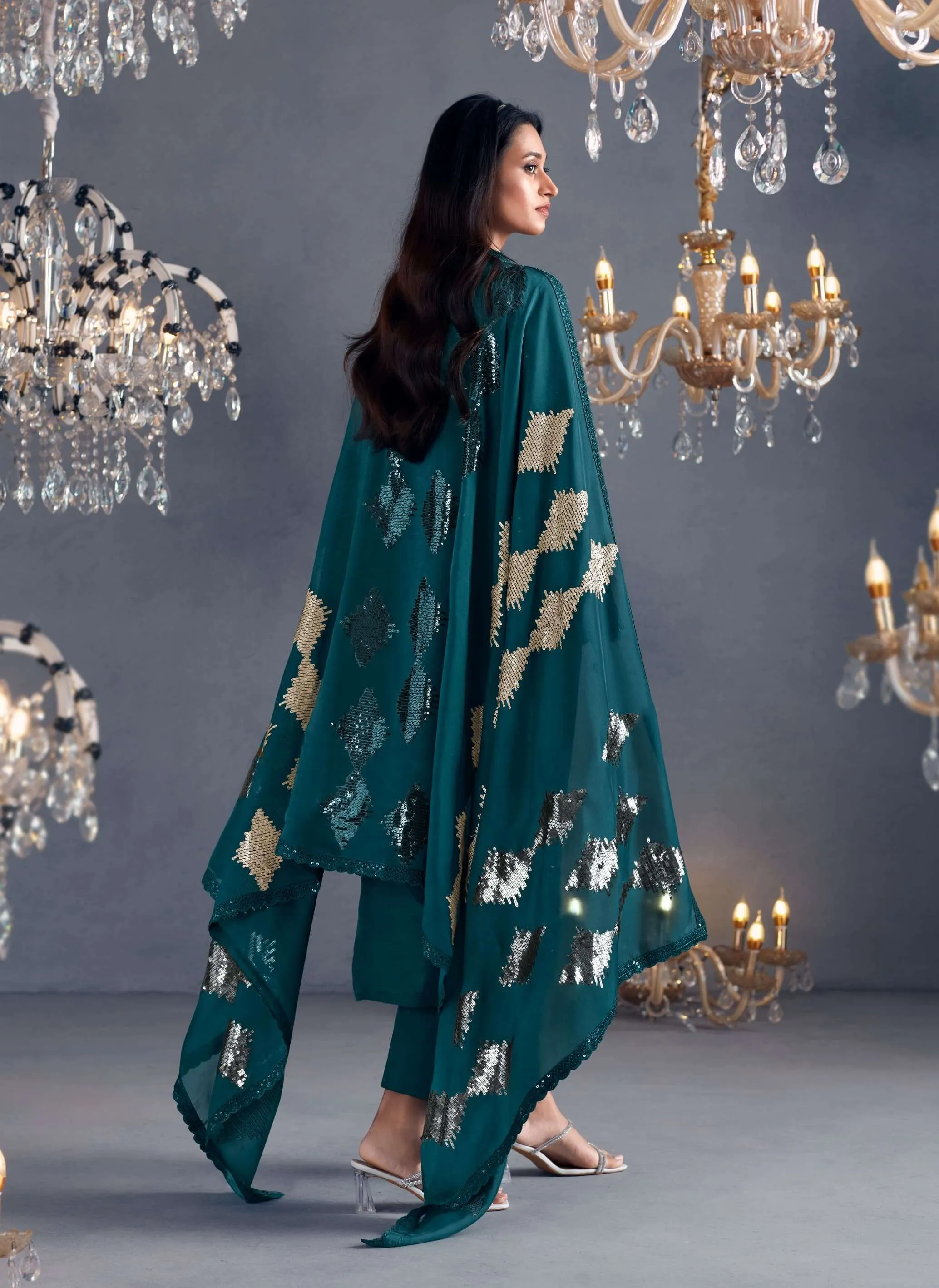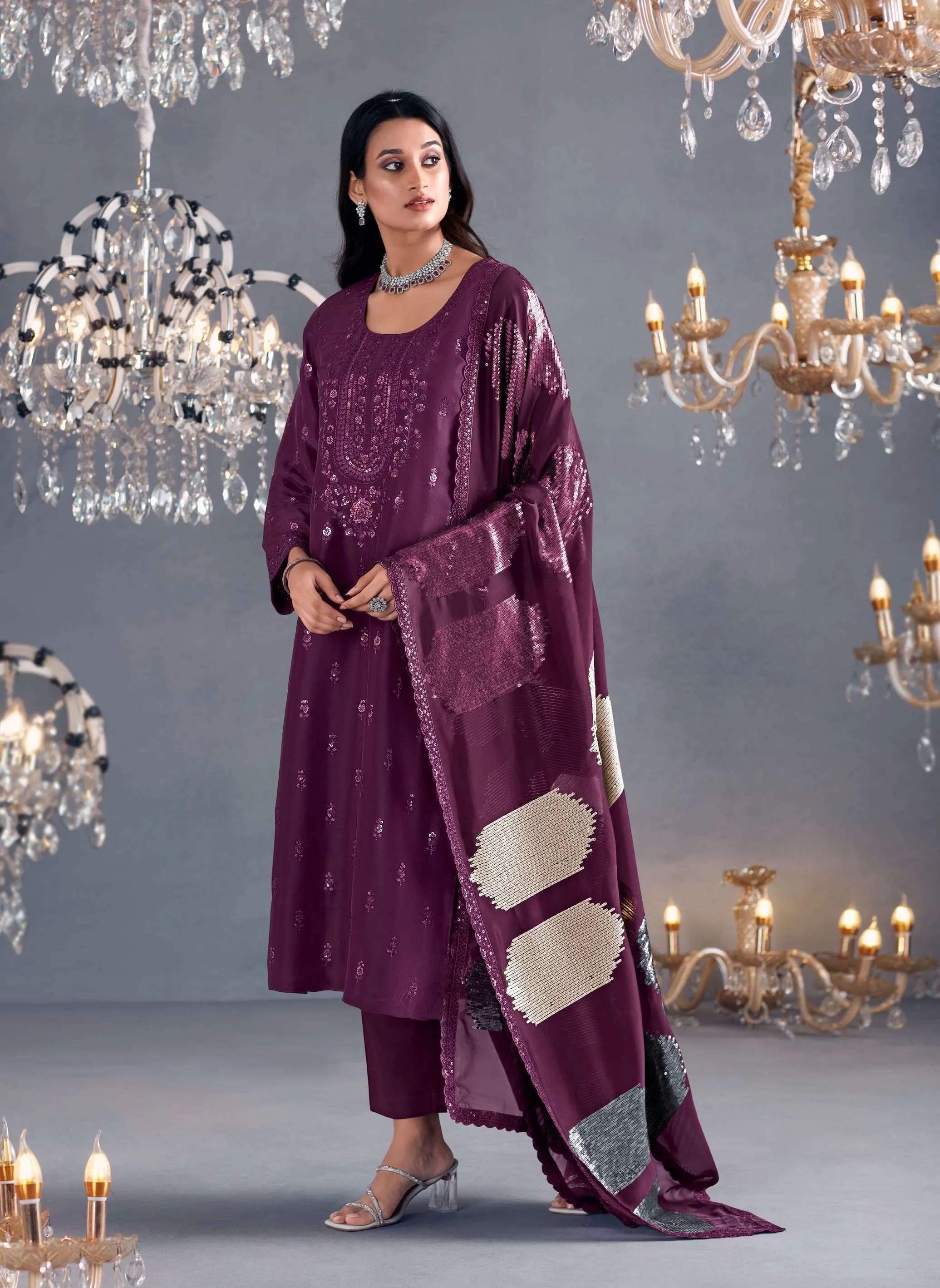 Pure Russian silk with toner thread & sequins embroidery, Scalloped embroidery on sleeves