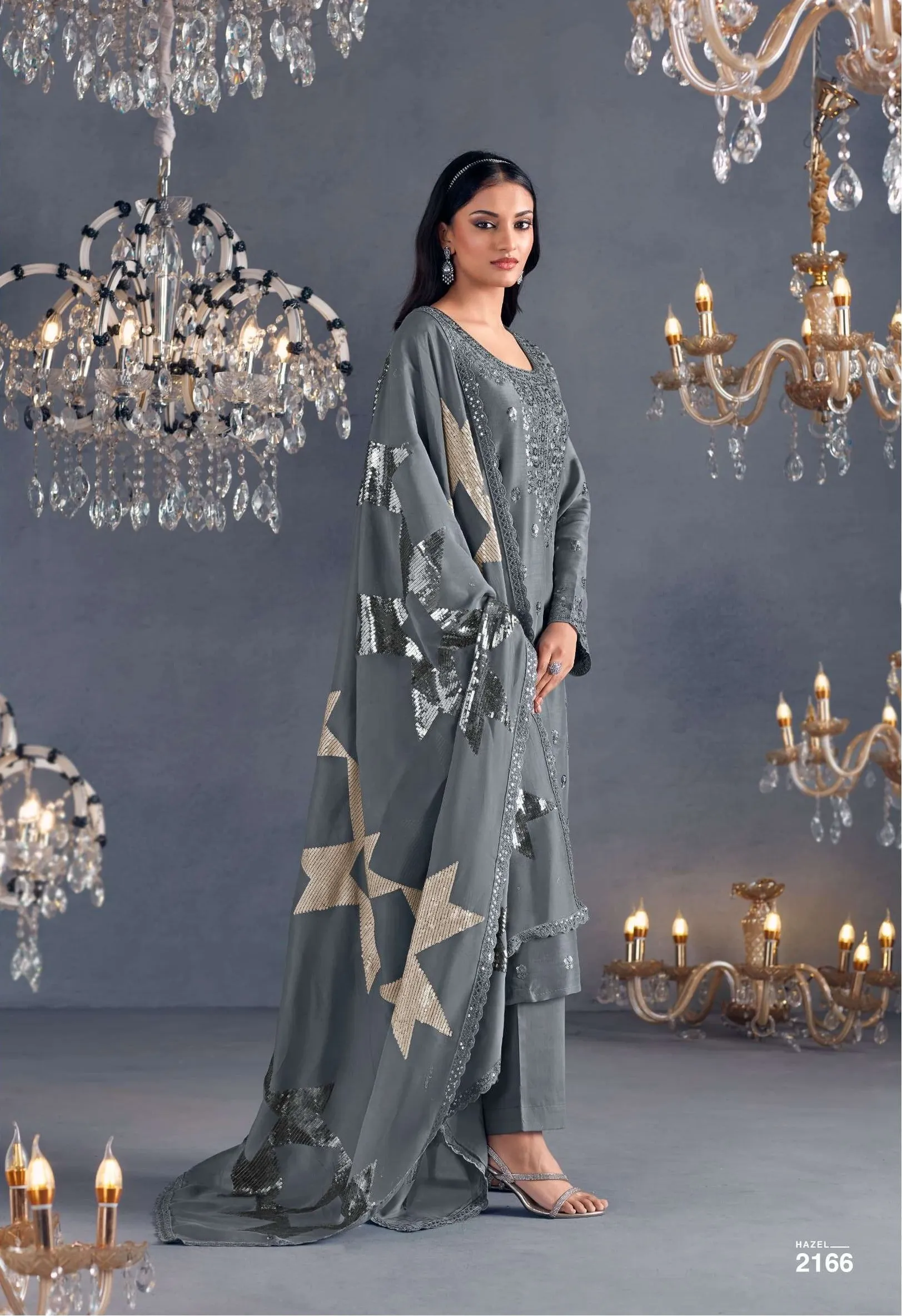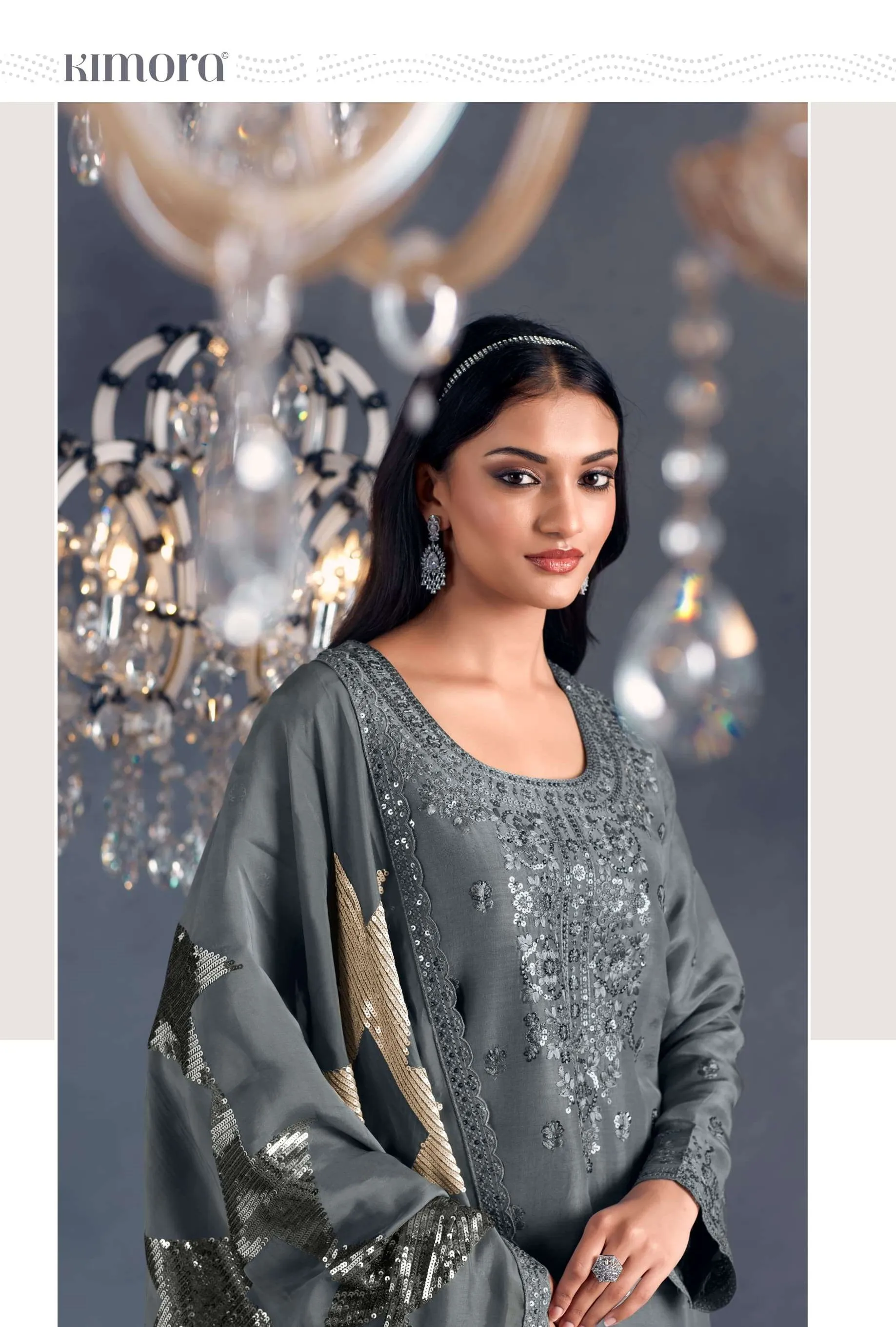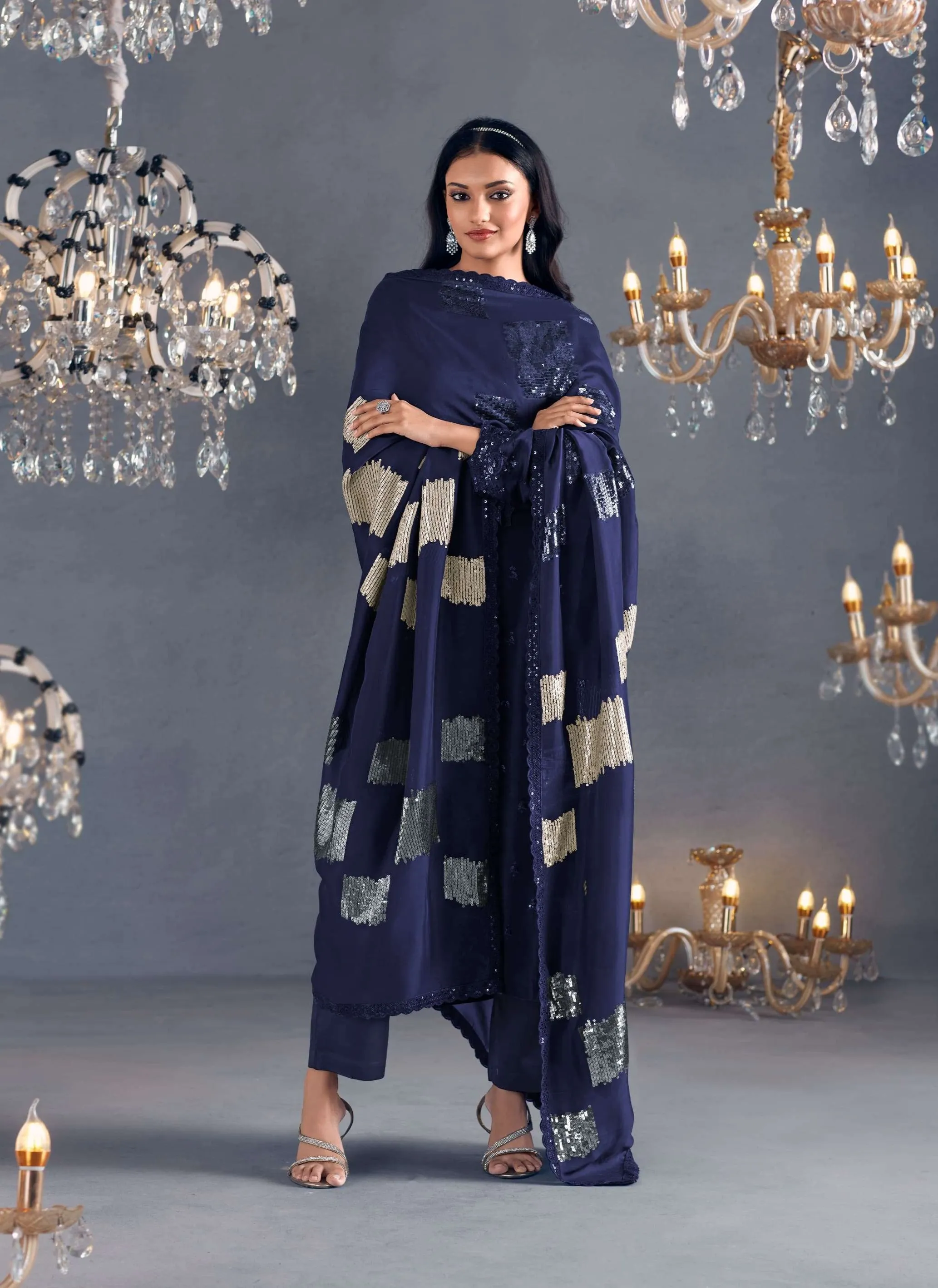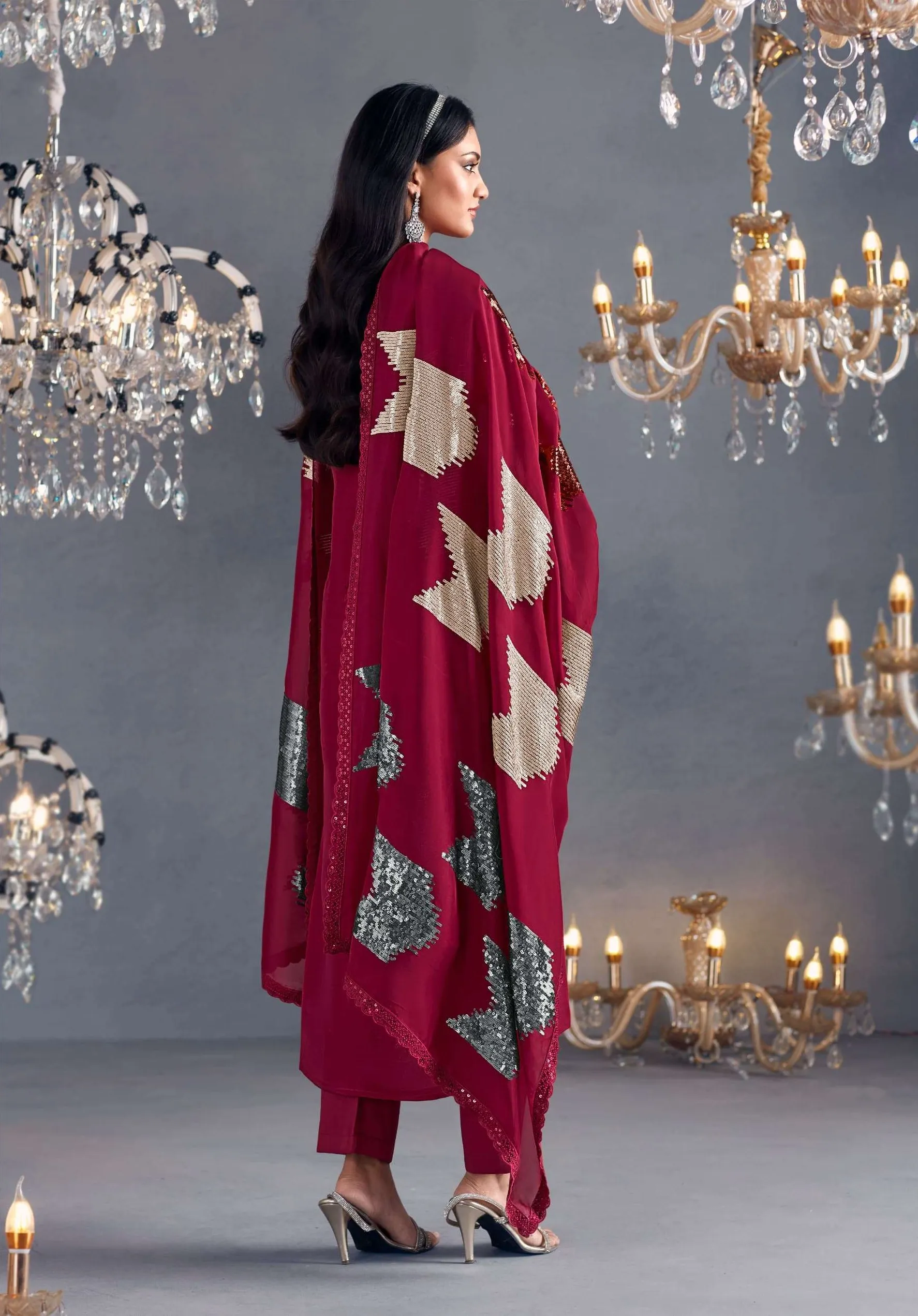 Pure Russian silk with toner thread & sequins embroidery, Scalloped embroidery on sleeves